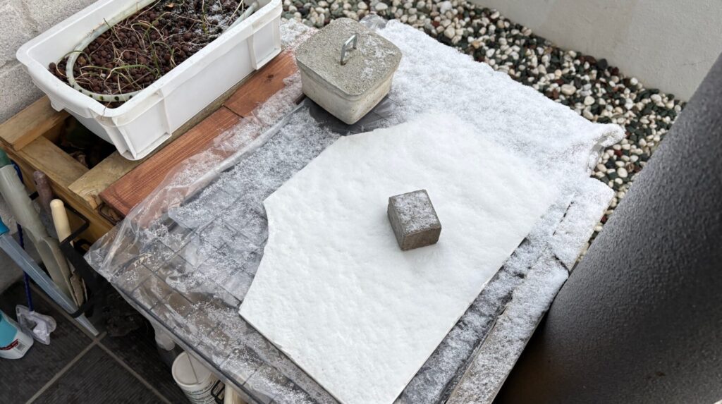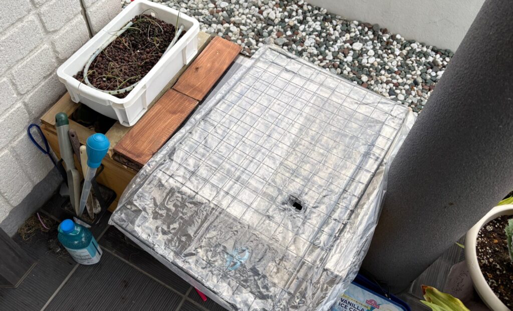 この反省を踏まえて、今年はビニールでフタをして氷結対策を実施。