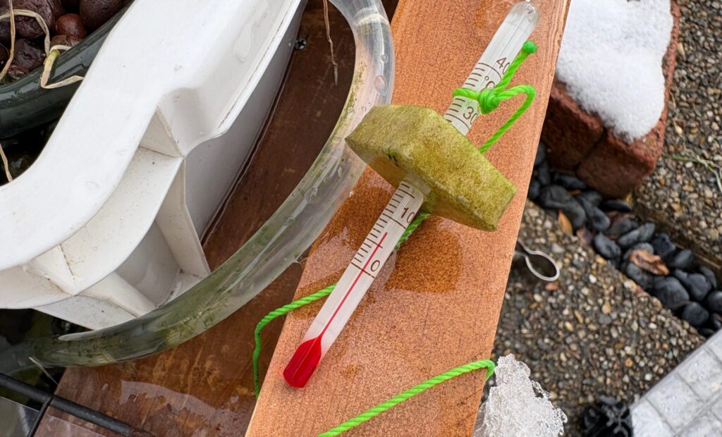 そこで今年は、簡易的にビニールでフタをして氷結対策を実施。水温は測っていませんが、一度も結氷しなかったことを考えると、おそらく最低でも5℃前後は保てていたはず。