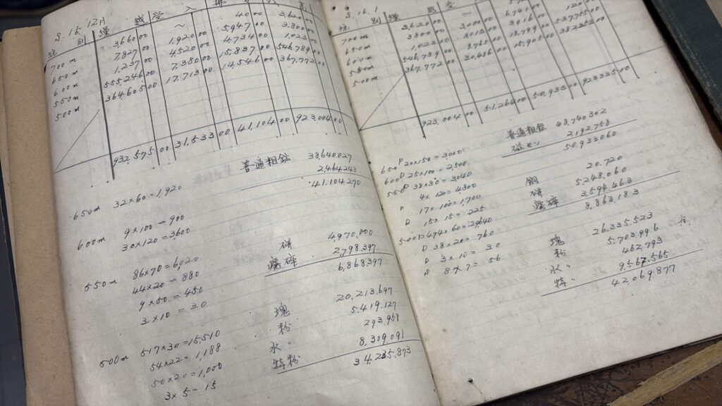これは、おそらく一日の生産日報だろうか。ノートには数字がびっしりと書き込まれ、しかも一文字一文字がとてもきれい。これを毎日、間違いなく計算して、書くって、当時の事務仕事の大変さが伝わってくる。